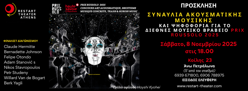 Το Σάββατο 8 Νοεμβρίου 2025, στις 18:00, το διεθνές Βραβείο Russolo 2025 φιλοξενείται στην Αθήνα, στο χώρο θεατρικού πολιτισμού Restart Theater Athens (Κοίλης 23, Άνω Πετράλωνα, 5’ από τον σταθμό ΗΣΑΠ Πετραλώνων), για μια μοναδική βραδιά αφιερωμένη στην ακουσματική και ηλεκτρονική μουσική.